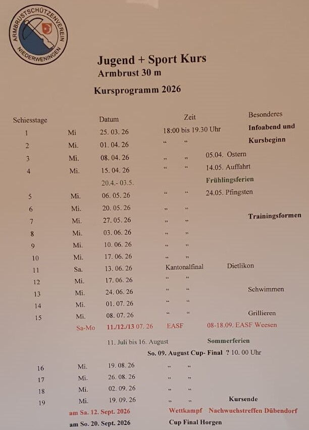 Die Teilnehmer sind über den Verein gegen Unfall versichert. Die Trainingsleiter sind vom Verband ausgebildet. Der Verein stellt Armbrüste und alle notwendigen Schiessutensilien zur Verfügung.